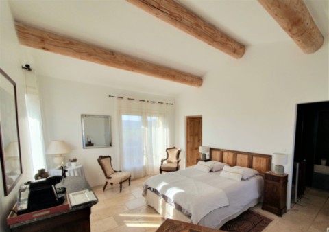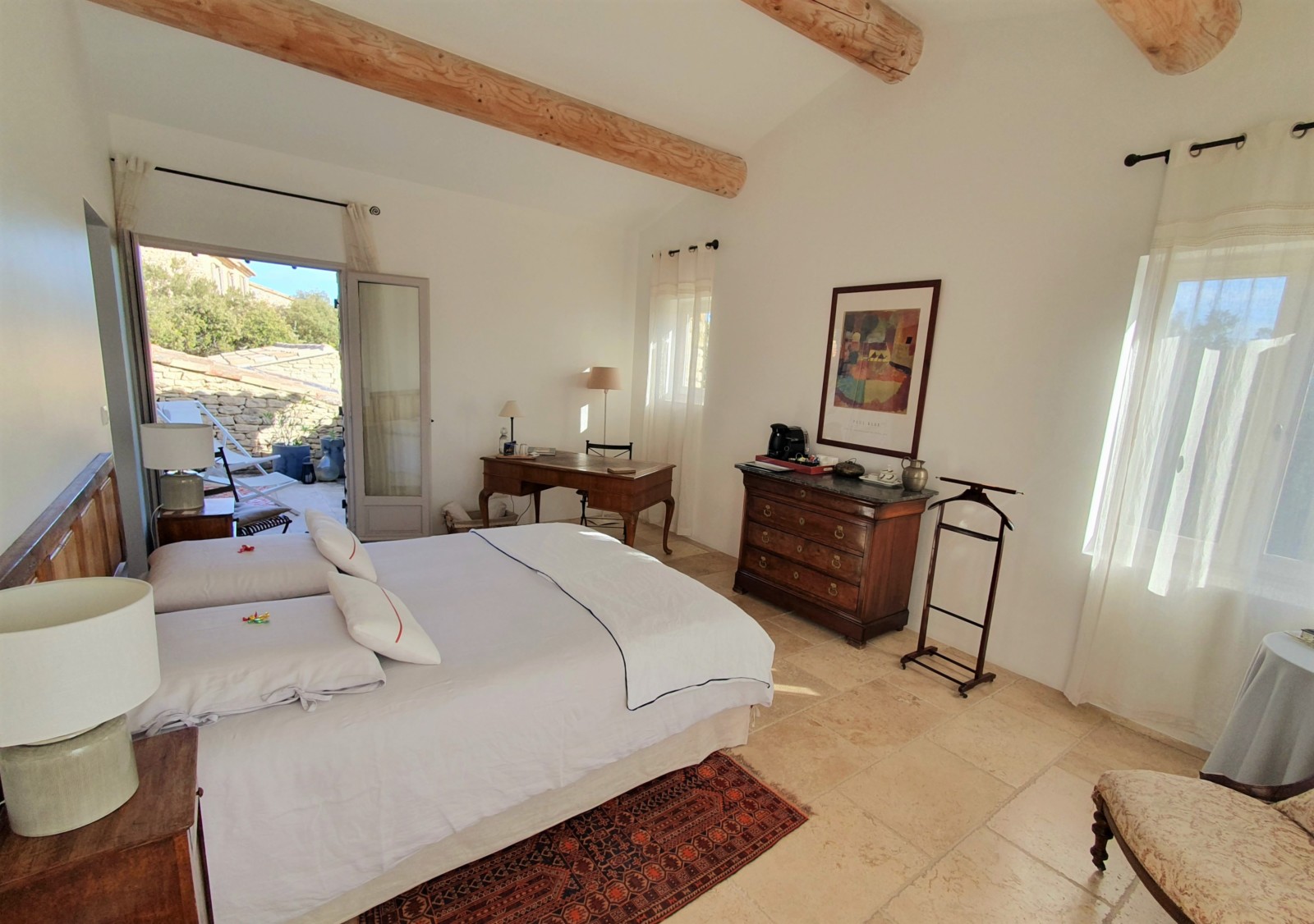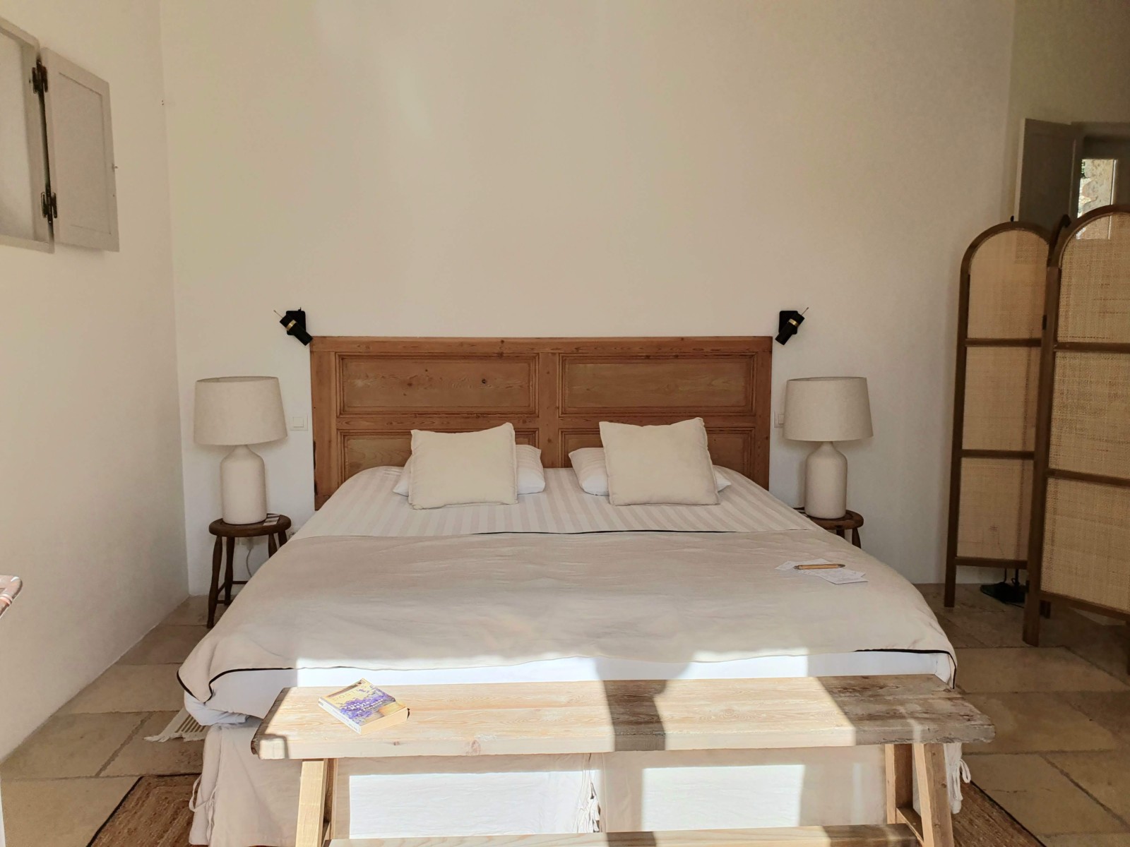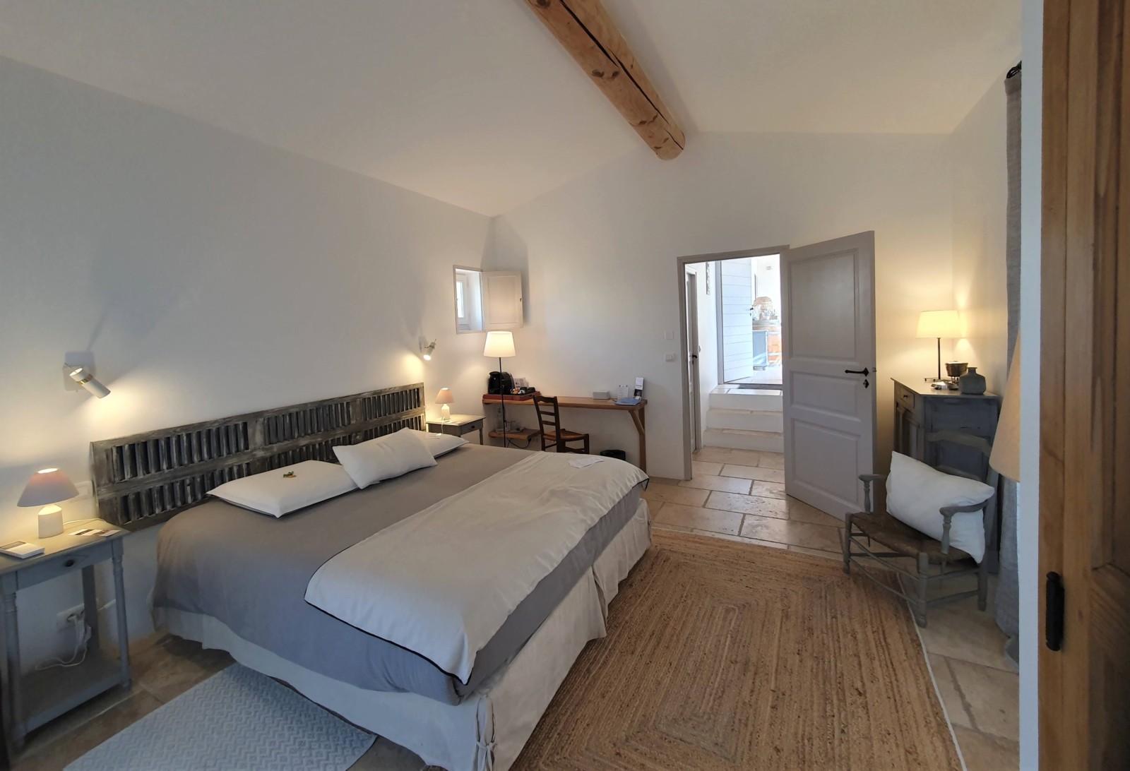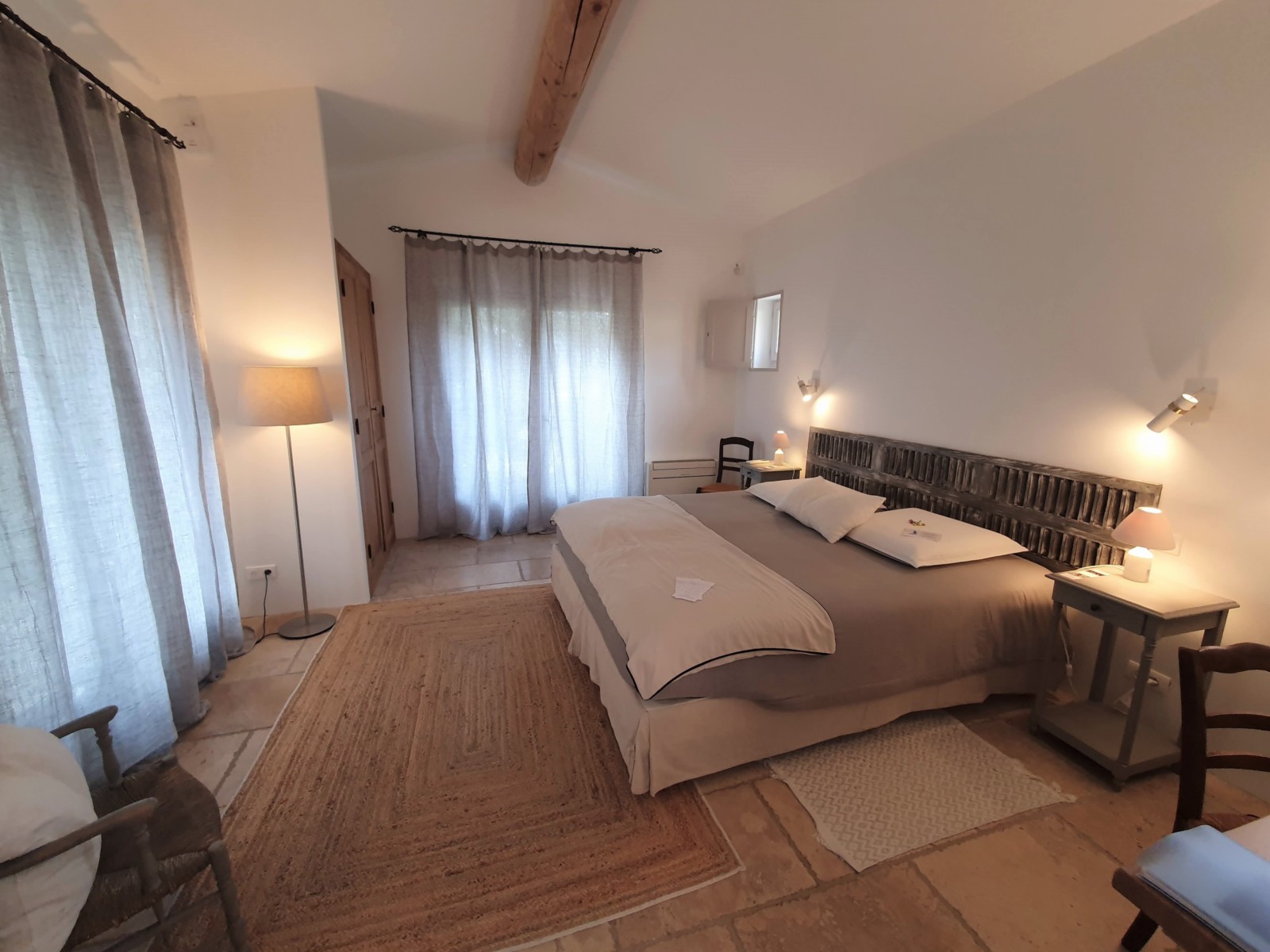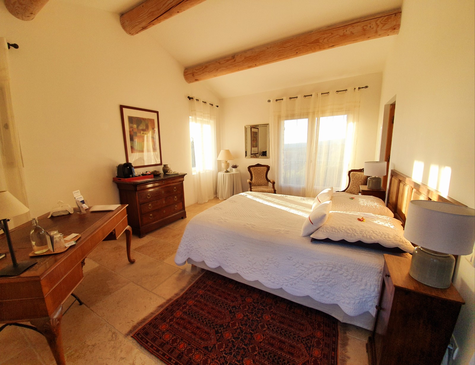 Située au 1er étage, c’est la chambre de Maître de la maison. Avec sa triple exposition orientée est – sud – ouest et sa terrasse tropézienne privative, elle offre des vues magnifiques sur le Luberon, les Alpilles, les Monts du Vaucluse, le jardin et la piscine.