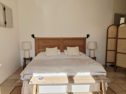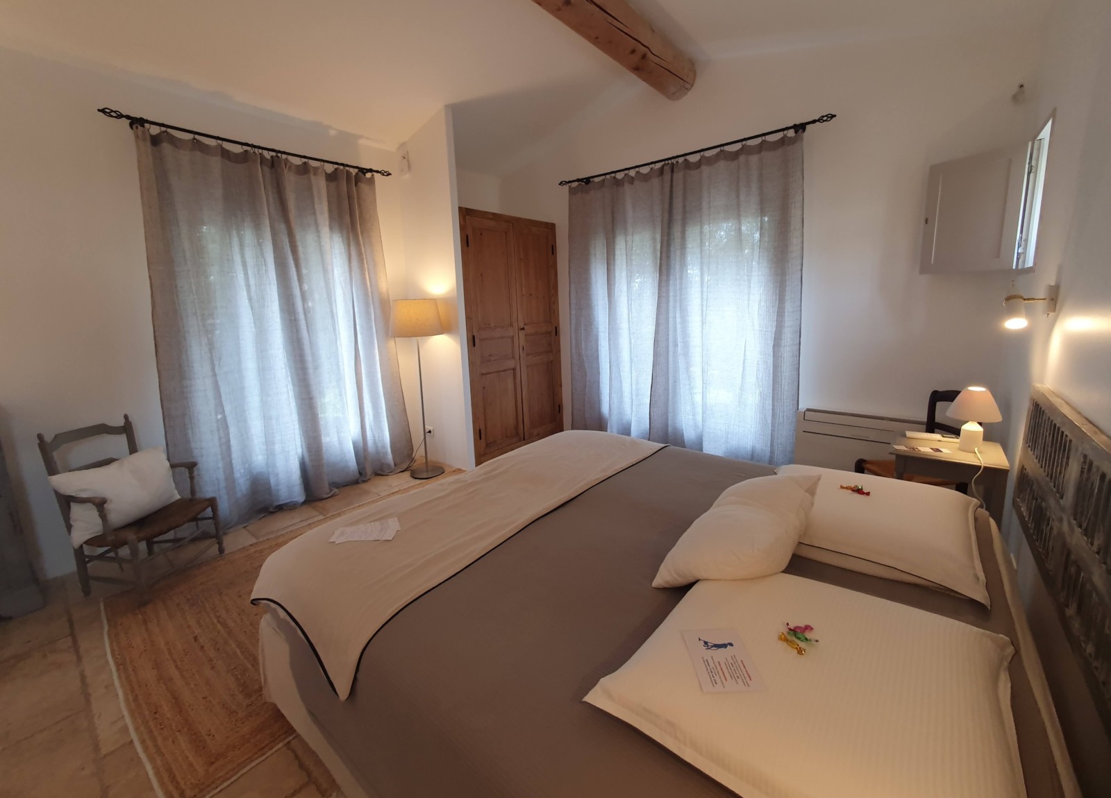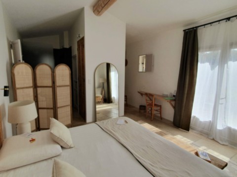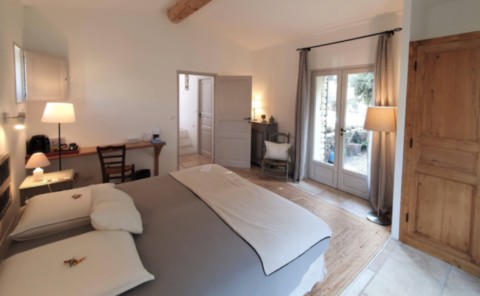 Cette très jolie chambre est située en rez de jardin, un peu à l'écart. Elle possède deux terrasses privatives protégées et calmes et un accès direct au jardin et à la piscine.