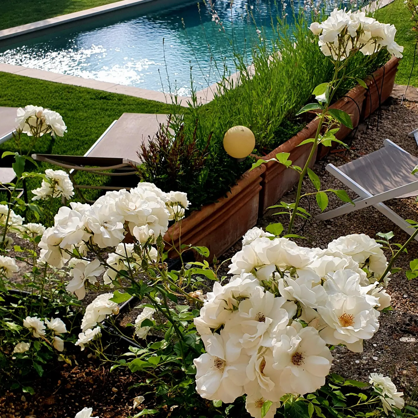 Quand la végétation aura grandie, elle garantira l'intimité de nos hôtes pour leurs siestes et leurs lectures, face au soleil et entourés de lauriers et de rosiers blancs, à quelques mètres de la piscine par un escalier privatif.